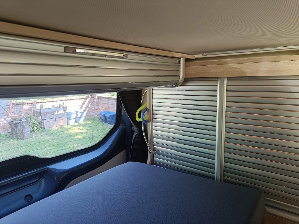 Tendine ed oscuranti della parte posteriore comode ed efficaci, mancano invece del tutto nella parte anteriore (parabrezza e finestrini delle portiere) ed utilizziamo i classici “schermi” posizionati con delle ventose, o delle tendine cucite amorevolmente da noi.