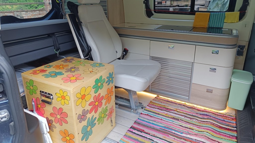 Noi (che viaggiamo sempre in due) abbiamo eliminato un sedile e costruito una cassa che contiene il wc chimico (quella a fiori nella foto), e offre un utile piano di appoggio. Non vi dico le facce dei nostri amici quando gli descriviamo il nostro bagno: nessuno si adatterebbe alle condizioni di uso diciamo “spartane”… Comunque secondo noi basta amarsi e si può affrontare anche una convivenza “strettissima”!