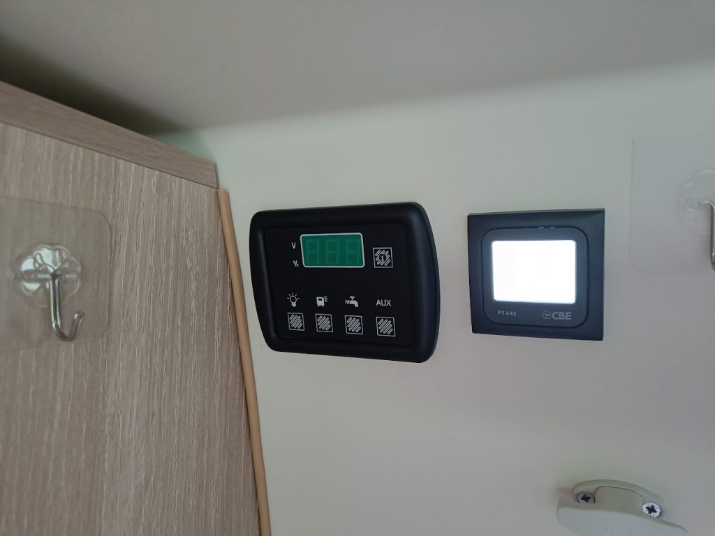Anche il pannello di controllo del veicolo è un po’ “cheap”: molto plasticoso, riempimento del serbatio dell’acque a step del 25%, uno dei controlli (luci esterne) che non è collegato a nulla, segnalazione del riempimento del serbatoio acque grige con una spia, senza livello, tensione delle due batterie ma nulla sullo stato di carica (ok forse questo con queste batterie non si può proprio fare)… insomma si poteva fare meglio.