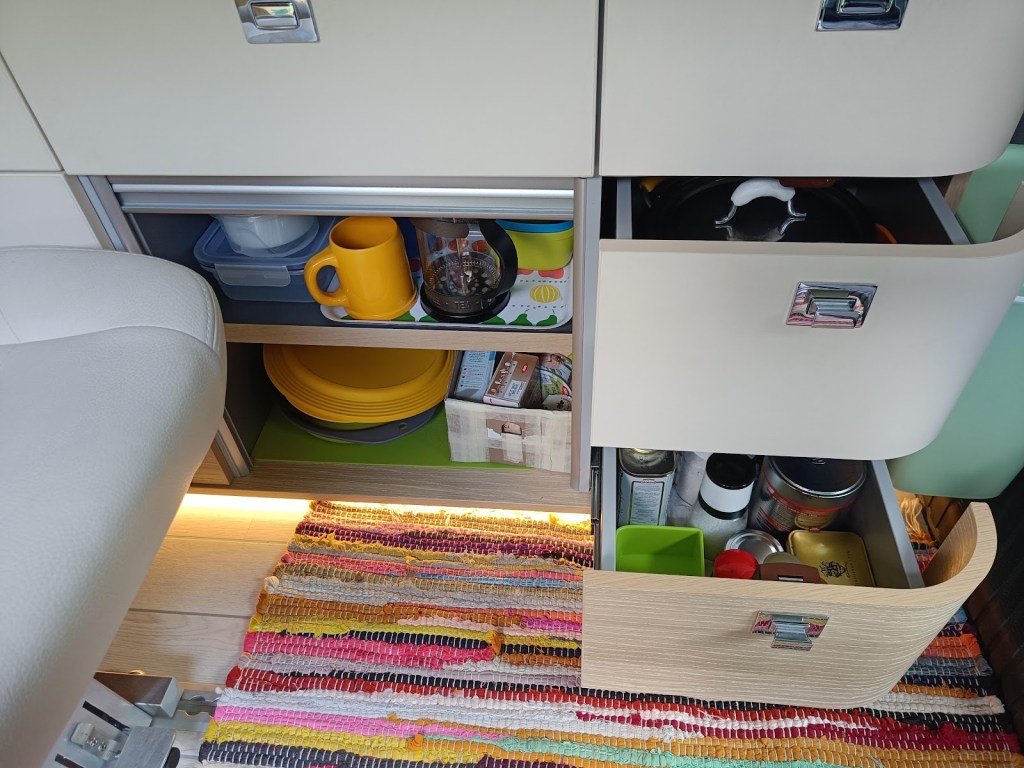 Diciamo che oltre allo stivaggio nei mobili e nella parte posteriore noi normalmente ci portiamo una borsa a testa per i vestiti e le due borse dei computer, a cui non possiamo mai rinunciare (la pensione è ancora lontana, purtroppo… ma viva lo smartworking!). Le borse trovano agevolmente posto sopra il letto inferiore ripiegato, permettendo l’accesso sia dall’esterno sia dall’interno del furgone (e quando piove fa piacere…).